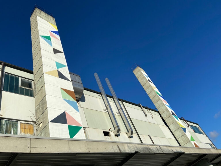 Bemalung von zwei 22 Meter hohen Türmen in der CI des künftigen moosaik – als Visualisierung der Vision der Familien Houdek, Baasel und Scherbaum, ein verbindendes Quartier zu schaffen.